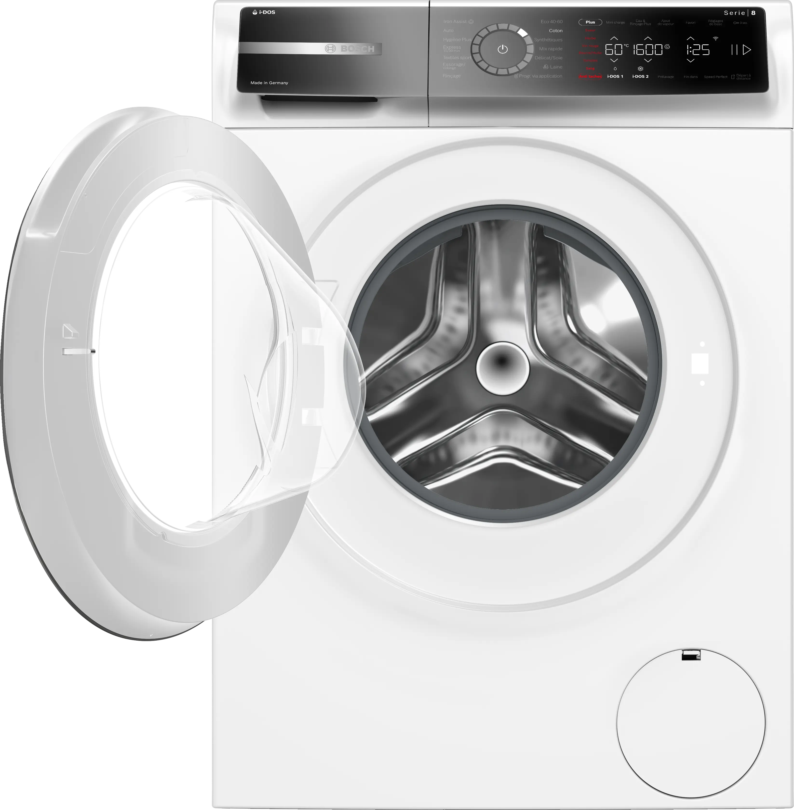 Vitesse d'essorage max.Note de bas de page 1: La vitesse d'essorage maximale est automatiquement réduite en cas de déséquilibre.: 1600 tours/min
