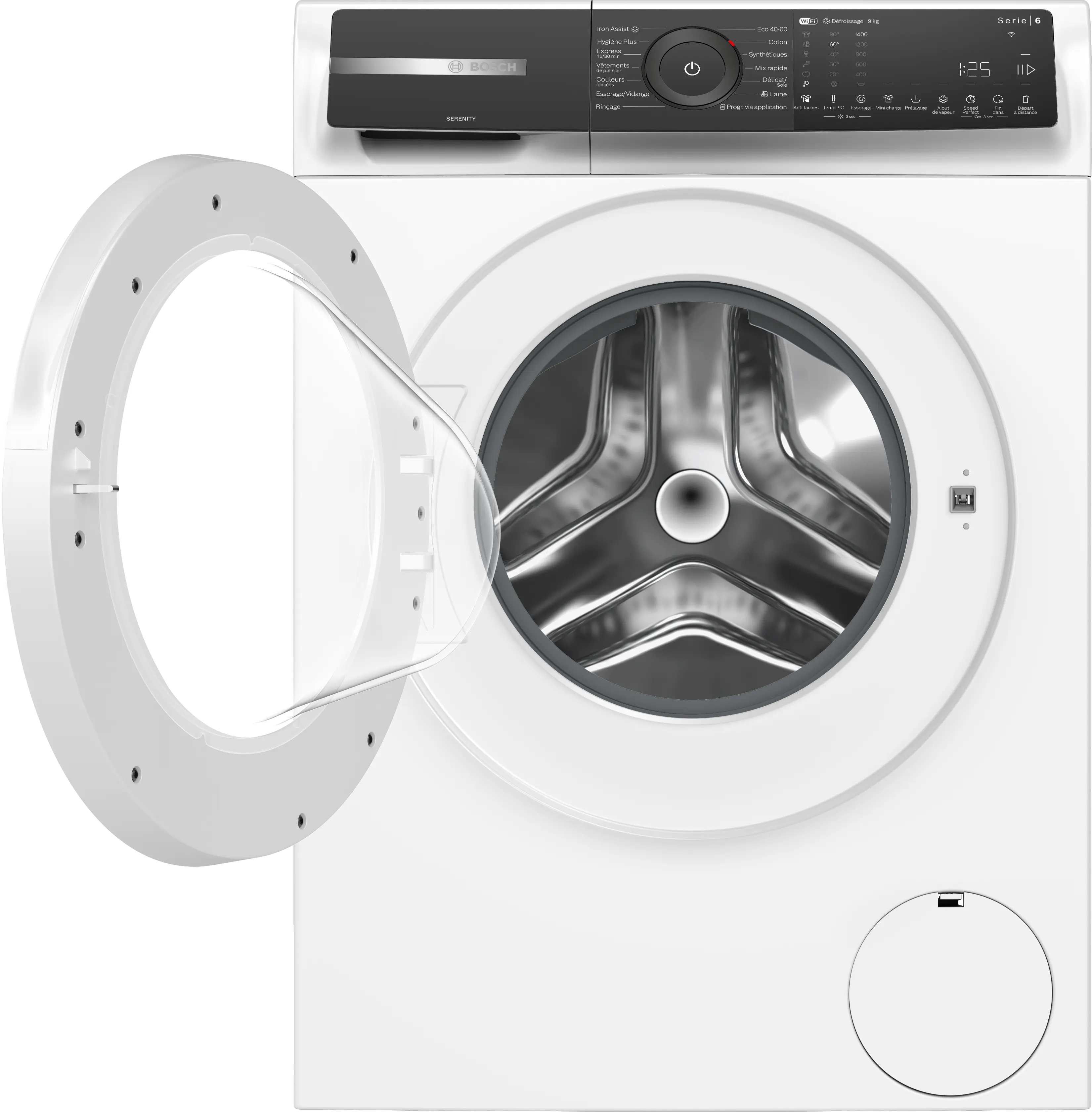 Vitesse d'essorage max.Note de bas de page 1: La vitesse d'essorage maximale est automatiquement réduite en cas de déséquilibre.: 1400 tours/min